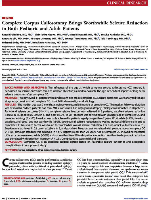 We reviewed 41 patients who underwent one-stage complete CC. Seizure outcomes were analyzed for age at epilepsy onset and at complete CC, focal MRI abnormality, and etiology.