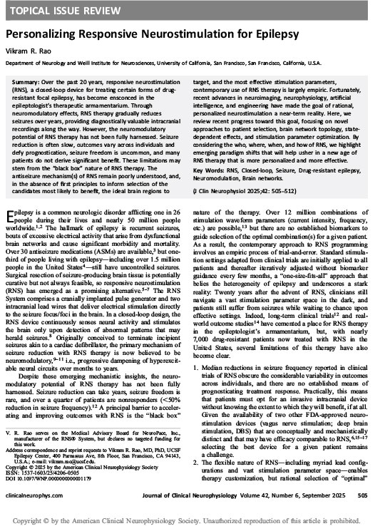 Over the past 20 years, responsive neurostimulation (RNS), a closed-loop device for treating certain forms of drug-resistant focal epilepsy, has become ensconced in the epileptologist's therapeutic armamentarium. Through neuromodulatory effects, RNS therapy gradually reduces seizures over years, providing diagnostically valuable intracranial recordings along the way. However, the neuromodulatory potential of RNS therapy has not been fully harnessed. Seizure reduction is often slow, outcomes vary across individuals and defy prognostication, seizure freedom is uncommon, and many patients do not derive significant benefit. These limitations may stem from the “black box” nature of RNS therapy. The antiseizure mechanism(s) of RNS remain poorly understood, and, in the absence of first principles to inform selection of the candidates most likely to benefit, the ideal brain regions to target, and the most effective stimulation parameters, contemporary use of RNS therapy is largely empiric. Fortunately, recent advances in neuroimaging, neurophysiology, artificial intelligence, and engineering have made the goal of rational, personalized neurostimulation a near-term reality. Here, we review recent progress toward this goal, focusing on novel approaches to patient selection, brain network topology, state-dependent effects, and stimulation parameter optimization. By considering the who, where, when, and how of RNS, we highlight emerging paradigm shifts that will help usher in a new age of RNS therapy that is more personalized and more effective.