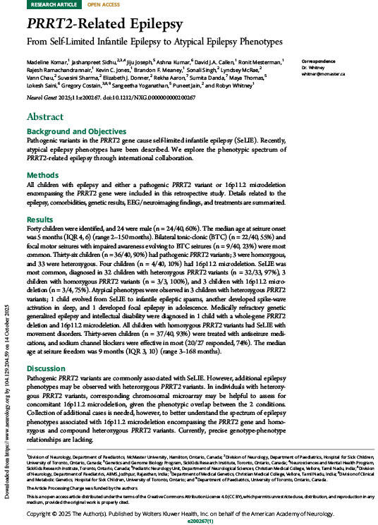 Forty children were identified, and 24 were male (n = 24/40, 60%). The median age at seizure onset was 5 months (IQR 4, 6) (range 2–150 months). Bilateral tonic-clonic (BTC) (n = 22/40, 55%) and focal motor seizures with impaired awareness evolving to BTC seizures (n = 9/40, 23%) were most common. Thirty-six children (n = 36/40, 90%) had pathogenic PRRT2 variants; 3 were homozygous, and 33 were heterozygous. Four children (n = 4/40, 10%) had 16p11.2 microdeletion. SeLIE was most common, diagnosed in 32 children with heterozygous PRRT2 variants (n = 32/33, 97%), 3 children with homozygous PRRT2 variants (n = 3/3, 100%), and 3 children with 16p11.2 microdeletion (n = 3/4, 75%). Atypical phenotypes were observed in 3 children with heterozygous PRRT2 variants; 1 child evolved from SeLIE to infantile epileptic spasms, another developed spike-wave activation in sleep, and 1 developed focal epilepsy in adolescence. Medically refractory genetic generalized epilepsy and intellectual disability were diagnosed in 1 child with a whole-gene PRRT2 deletion and 16p11.2 microdeletion. All children with homozygous PRRT2 variants had SeLIE with movement disorders. Thirty-seven children (n = 37/40, 93%) were treated with antiseizure medications, and sodium channel blockers were effective in most (20/27 responded, 74%). The median age at seizure freedom was 9 months (IQR 3, 10) (range 3–168 months).