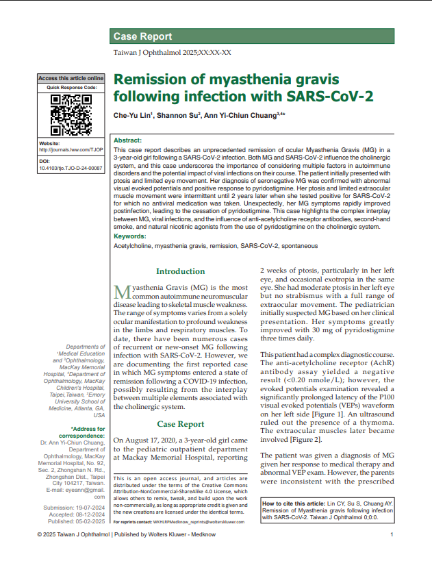 This case report describes an unprecedented remission of ocular Myasthenia Gravis (MG) in a 3-year-old girl following a SARS-CoV-2 infection. Both MG and SARS-CoV-2 influence the cholinergic system, and this case underscores the importance of considering multiple factors in autoimmune disorders and the potential impact of viral infections on their course. The patient initially presented with ptosis and limited eye movement. Her diagnosis of seronegative MG was confirmed with abnormal visual evoked potentials and positive response to pyridostigmine. Her ptosis and limited extraocular muscle movement were intermittent until 2 years later when she tested positive for SARS-CoV-2 for which no antiviral medication was taken. Unexpectedly, her MG symptoms rapidly improved postinfection, leading to the cessation of pyridostigmine. This case highlights the complex interplay between MG, viral infections, and the influence of anti-acetylcholine receptor antibodies, second-hand smoke, and natural nicotinic agonists from the use of pyridostigmine on the cholinergic system.