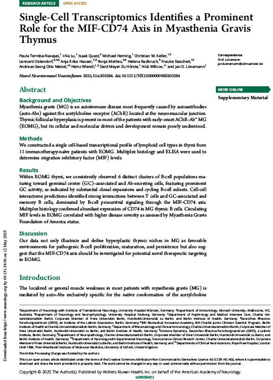 Within EOMG thymi, we consistently observed 6 distinct clusters of B-cell populations maturing toward germinal center (GC)–associated and Ab-secreting cells, featuring prominent GC activity, as indicated by substantial clonal expansions and cycling B-cell subsets. Cell-cell interactome predictions identified strong interactions between T cells and GC-associated and memory B cells, dominated by B-cell prosurvival signaling through the MIF-CD74 axis. Multiplex histology confirmed abundant expression of CD74 in MG thymic B cells. Circulating MIF levels in EOMG correlated with higher disease severity as assessed by Myasthenia Gravis Foundation of America status.