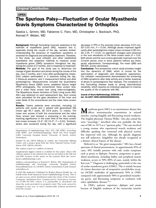 Although fluctuating muscular weakness is the hallmark of myasthenia gravis (MG), research into it, especially during the course of the day, remains limited. Understanding the dynamics of myasthenic symptoms is essential for diagnosis and anticipatory treatment. Therefore, in this study, we used orthoptic and other established quantitative and subjective methods to measure ocular myasthenia gravis (OMG) symptoms throughout the day, during the course of 2 months, and in response to treatment.